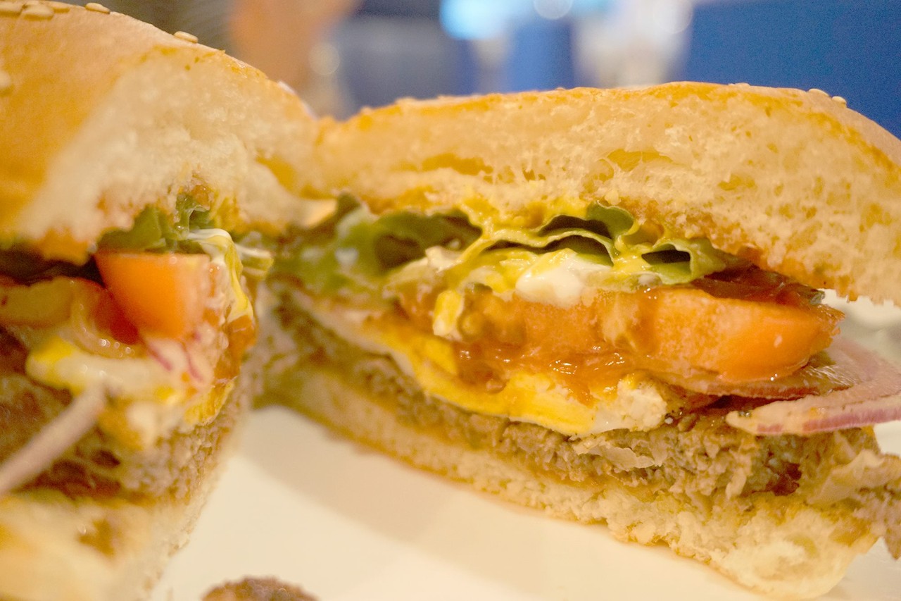 すべてのパーツを搭載して、パテ・バンズ共に直径15センチの大型バーガーが完成しました。