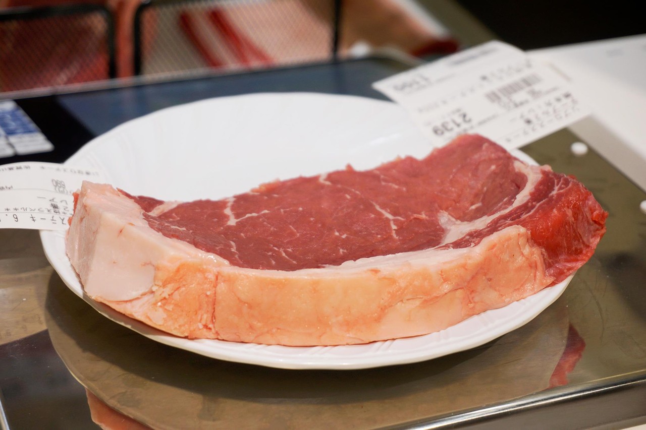 目の前で職人さん(カットマイスター)が、リブロースのブロックを300gにカットします。