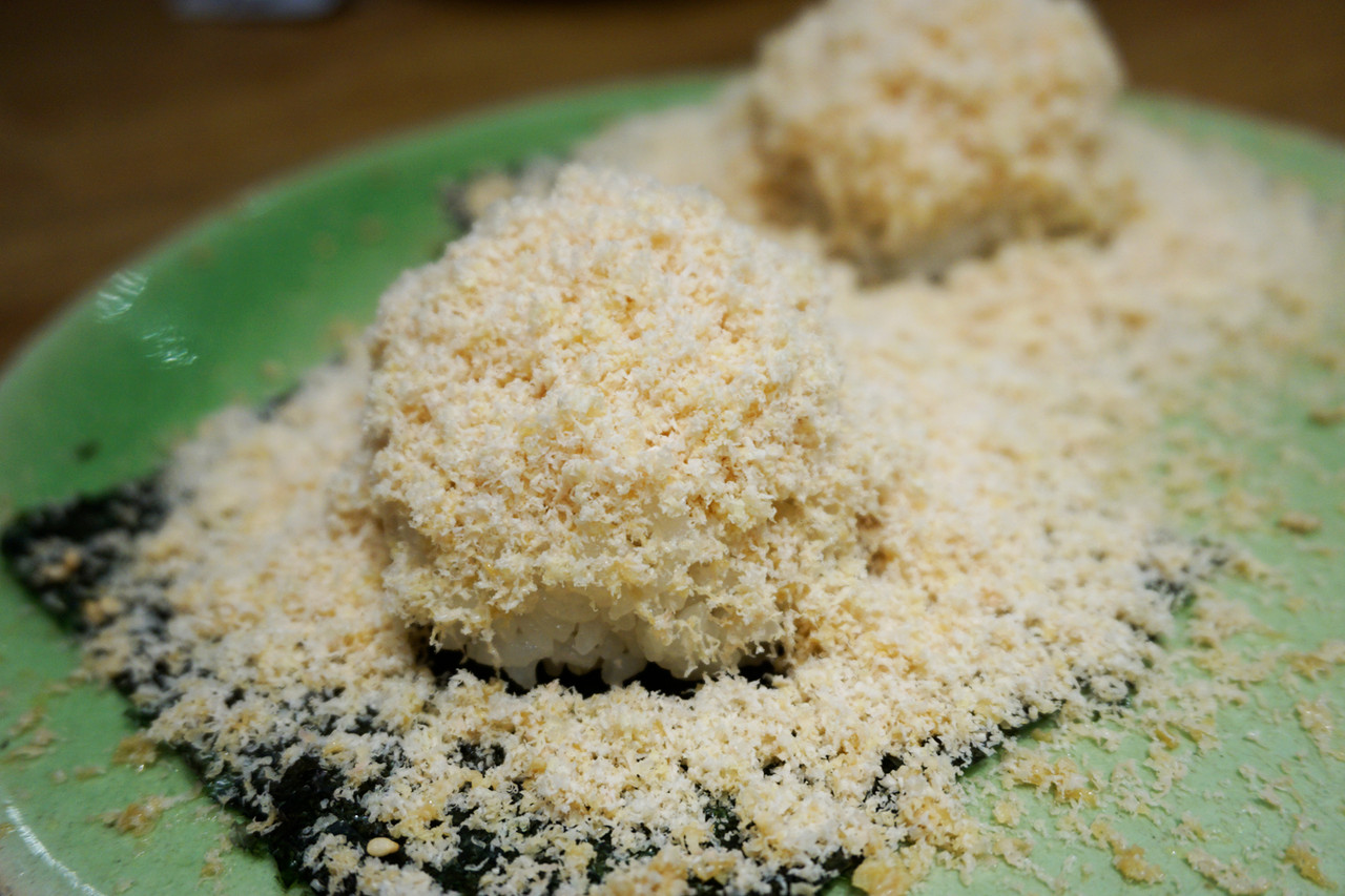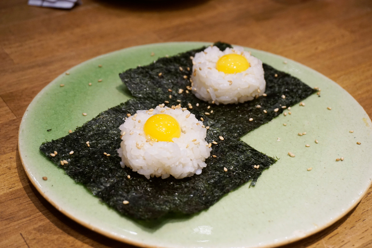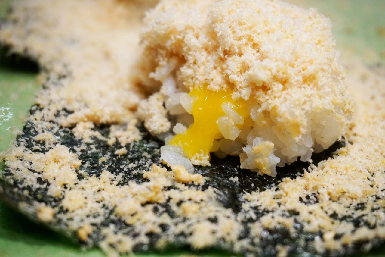 最初に卓上に来たのは、この卵黄が乗ったオープンおにぎり。