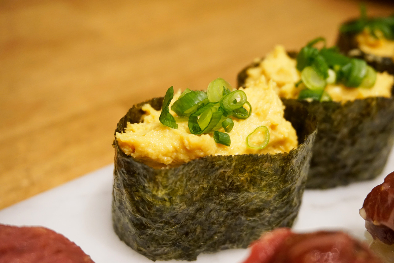 肉寿司のエンタテイメント『フォアグラまみれ 玉』は、削ったホワイトチョコレートのような
