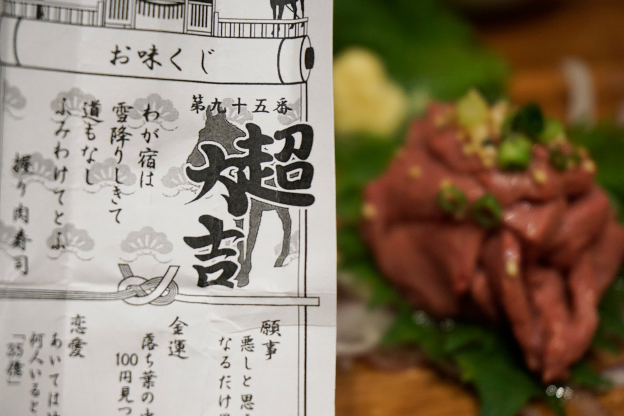 『超大吉』を引き当てた後輩は、次回来店時ワンドリンクサービスの特典を頂きました。