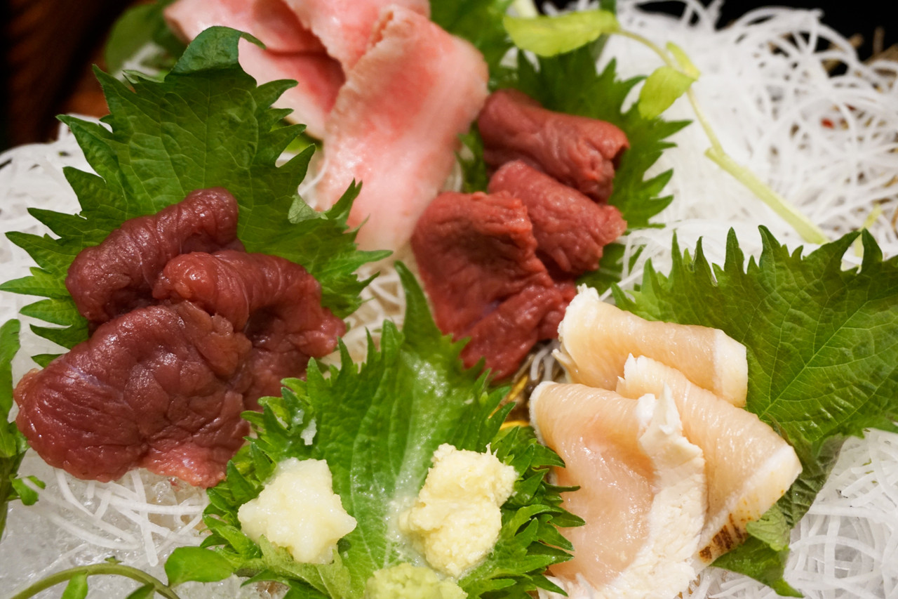 低温調理された牛肉の霜降り刺し・馬の赤身刺し・馬のヒレ刺し・鶏の湯引き刺しです。