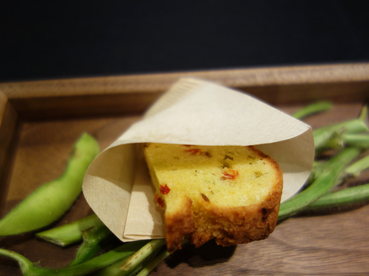 お通しは、枝豆・トマト・アンチョビのケークサレです。