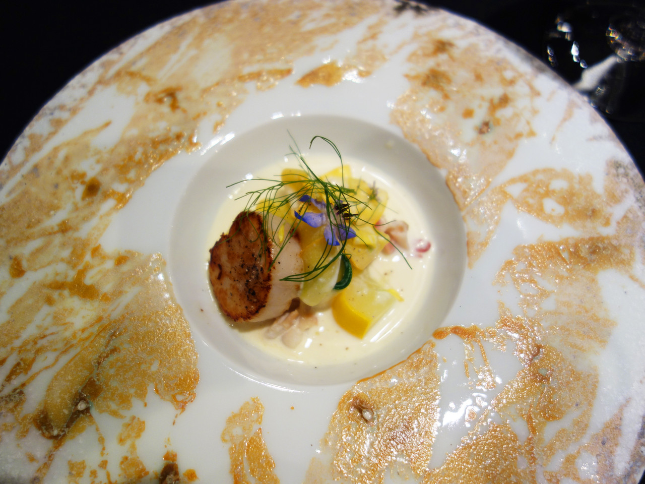 帆立のソテーと北寄貝のフリカッセ ズッキーニ添え ペルノー風味