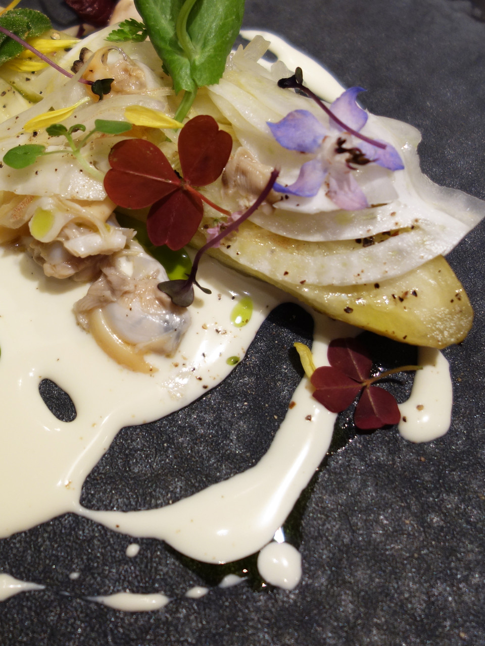 冷たい前菜は、クリーミーなお茄子とアサリ。