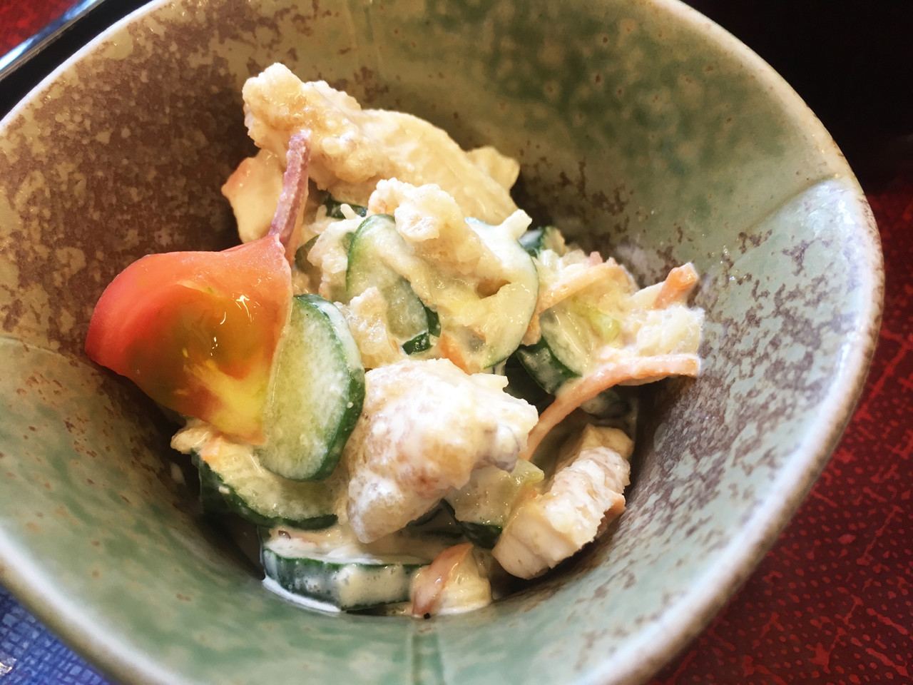 ポテサラのように見えますが、蒸し鶏と野菜のマヨ和え。