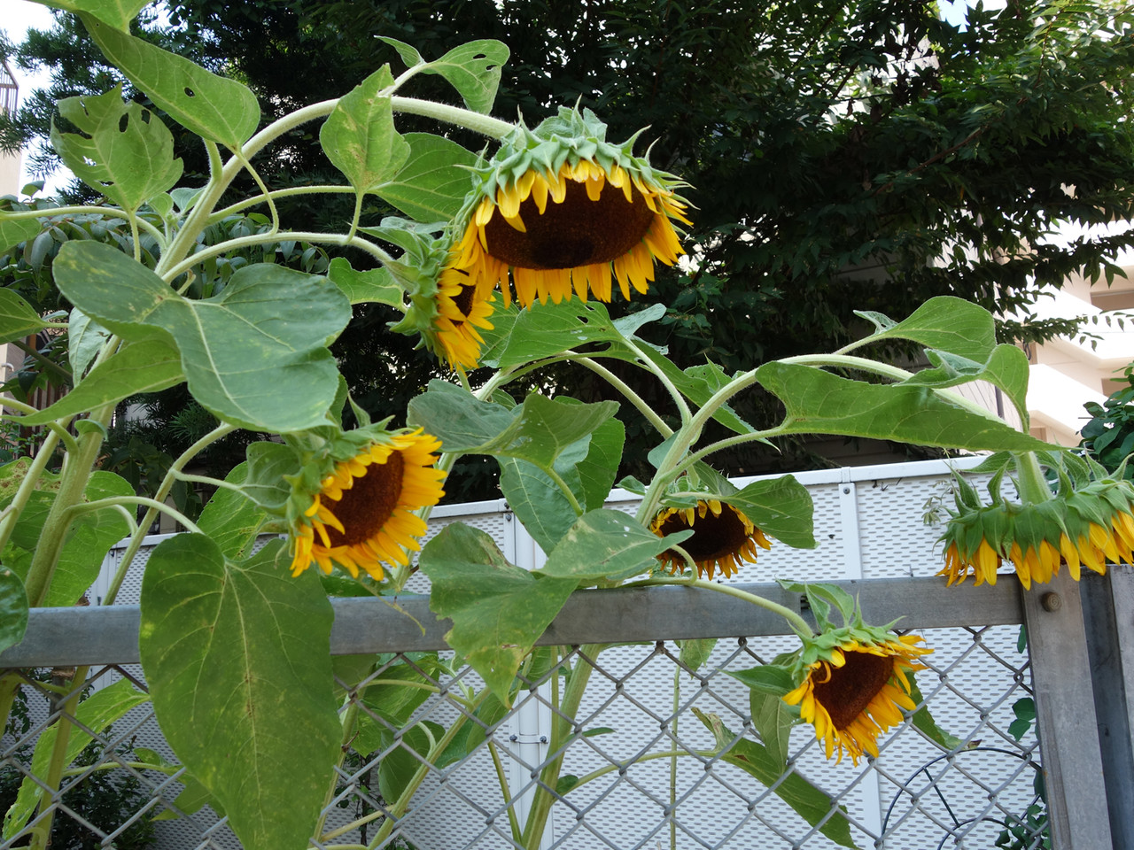 コインパーキングの傍に咲く向日葵(ひまわり)は猛暑のせいかうなだれていましたが、