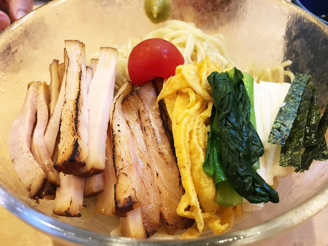 たっぷりの炙りチャーシュー・錦糸玉子・小松菜・山芋・海苔・プチトマト。