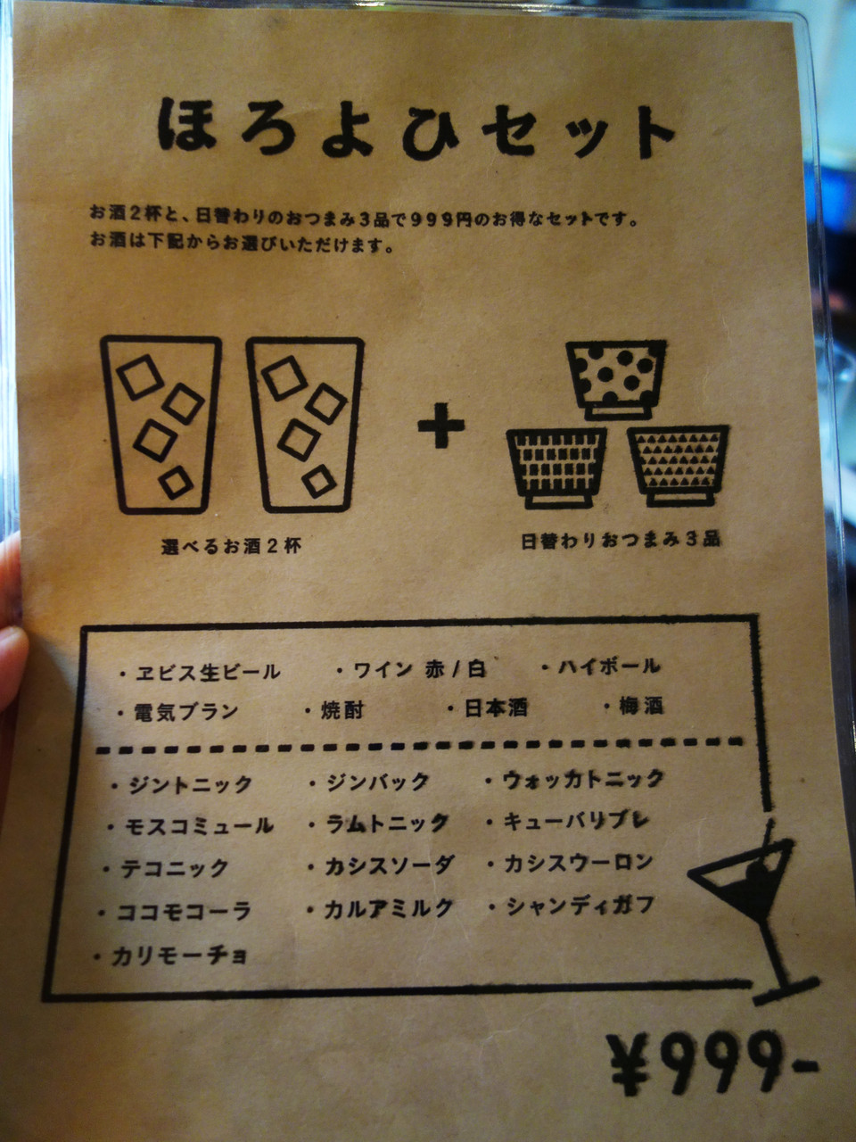 夜は、お酒2杯+おつまみ3品のほろ酔いセット999円もあります。