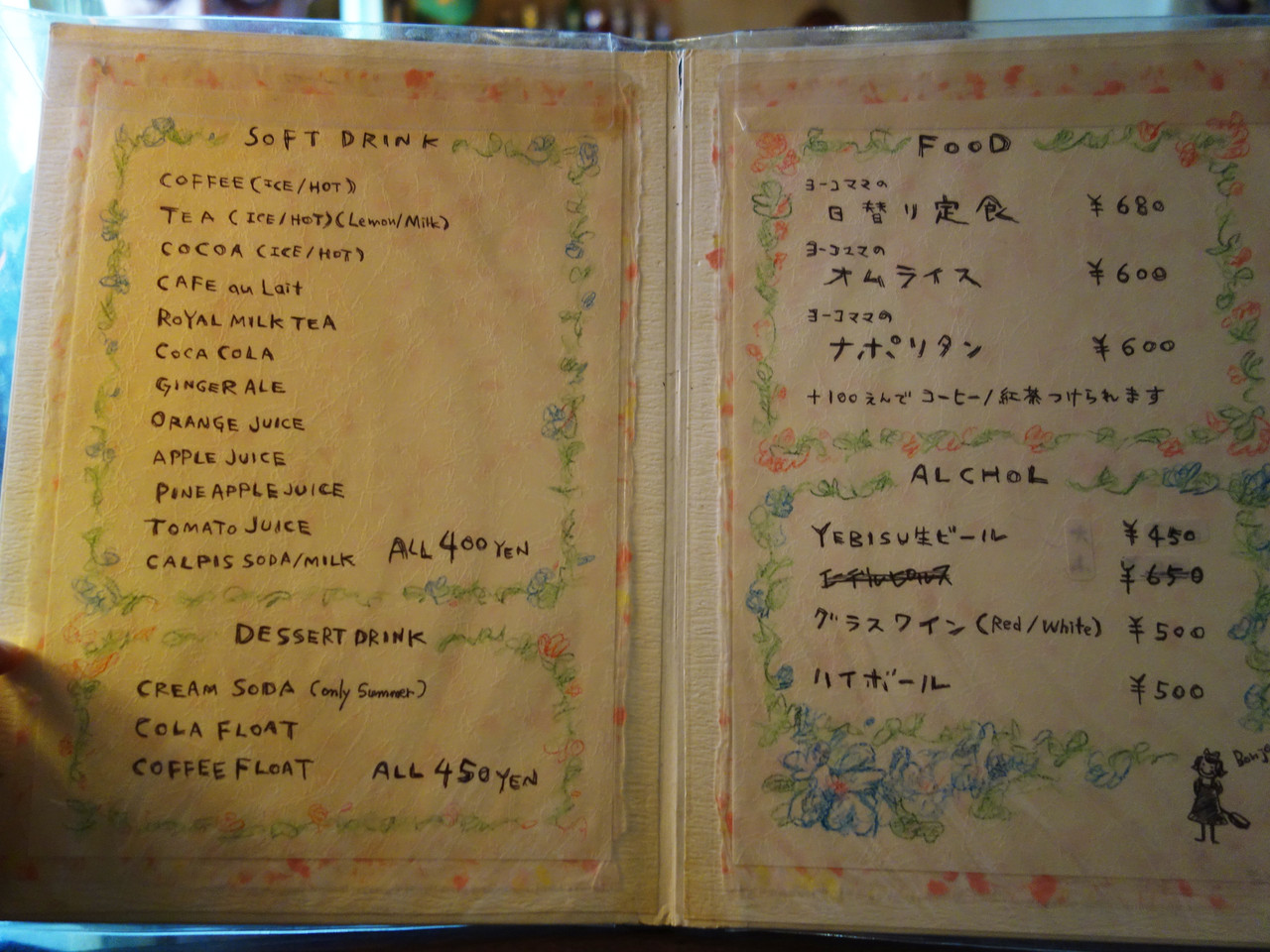 食事は、ナポリタン600円・オムライス600円・日替わり定食680円のみです。