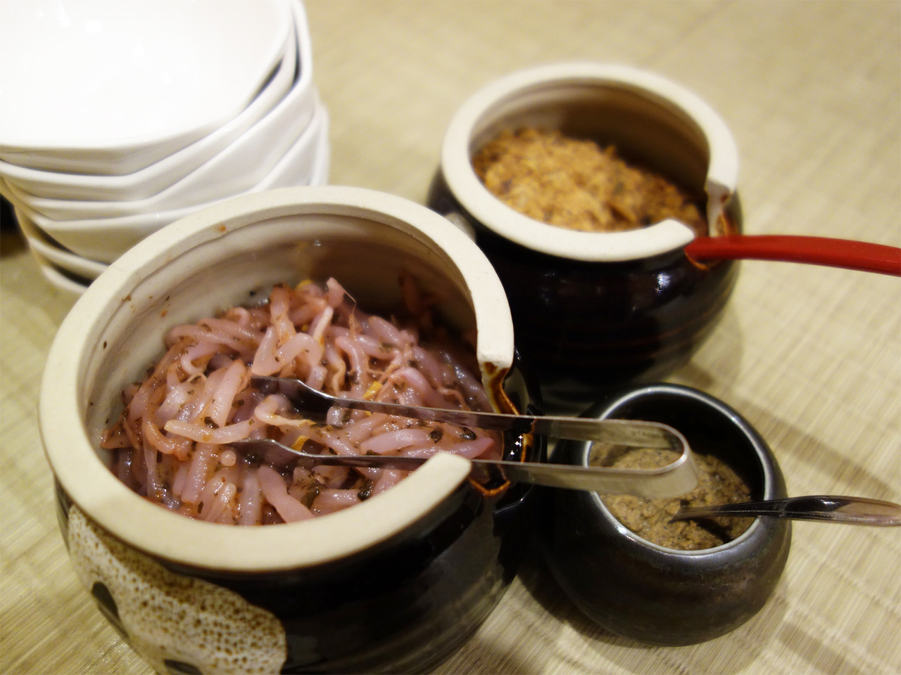 卓上には、味変用の自家製魚粉・梅モヤシ・柚子胡椒があります。