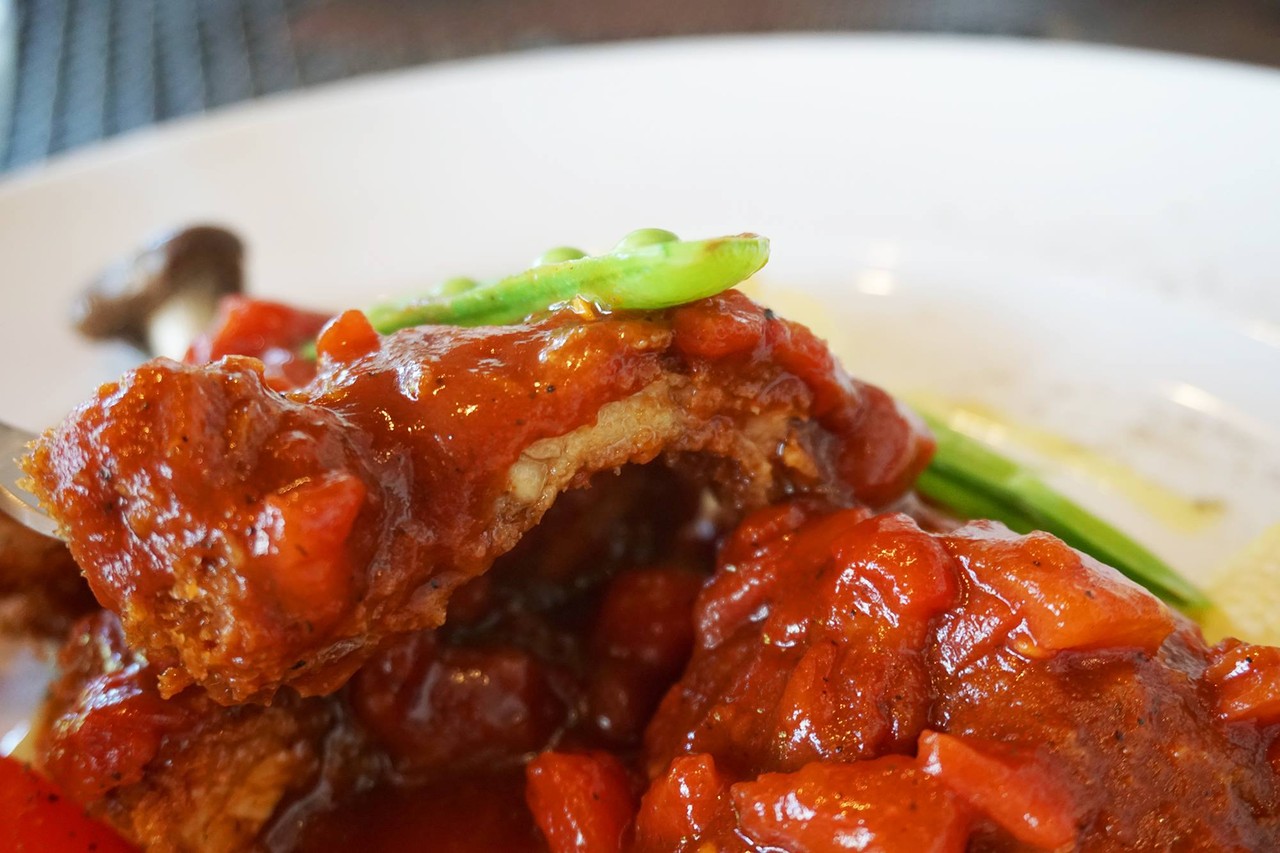 本場のミラノカツレツは揚げ焼きした仔牛肉ですが、こちらは若鶏のもも肉のフライにトマトソースがかかったものです。