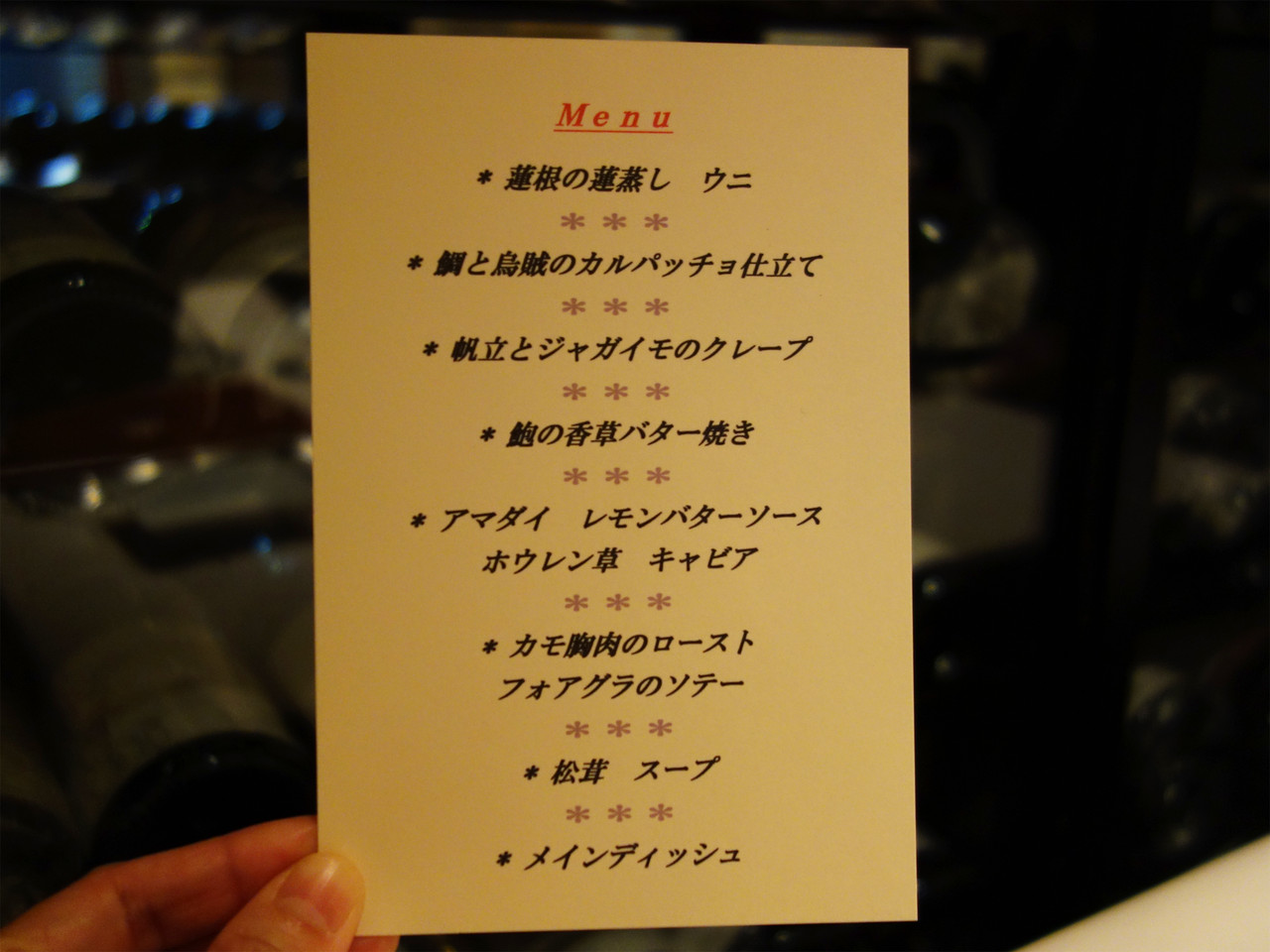 秋の食材に合わせたグランクリュの赤に期待して、前半は飲むキャパを空けておきます。