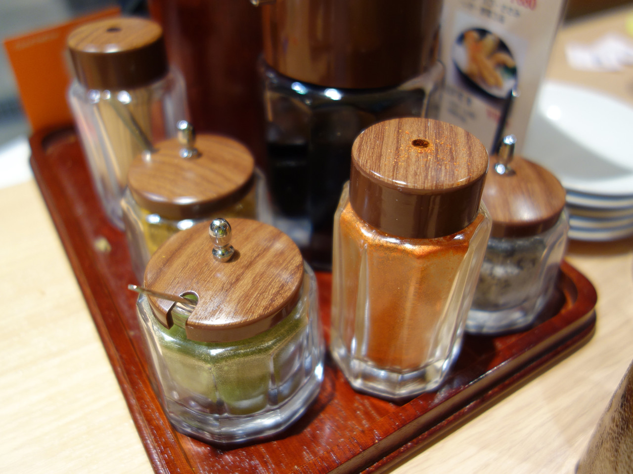 卓上には、抹茶・ゴマ・カレー粉入りの調味塩も用意されていますが、