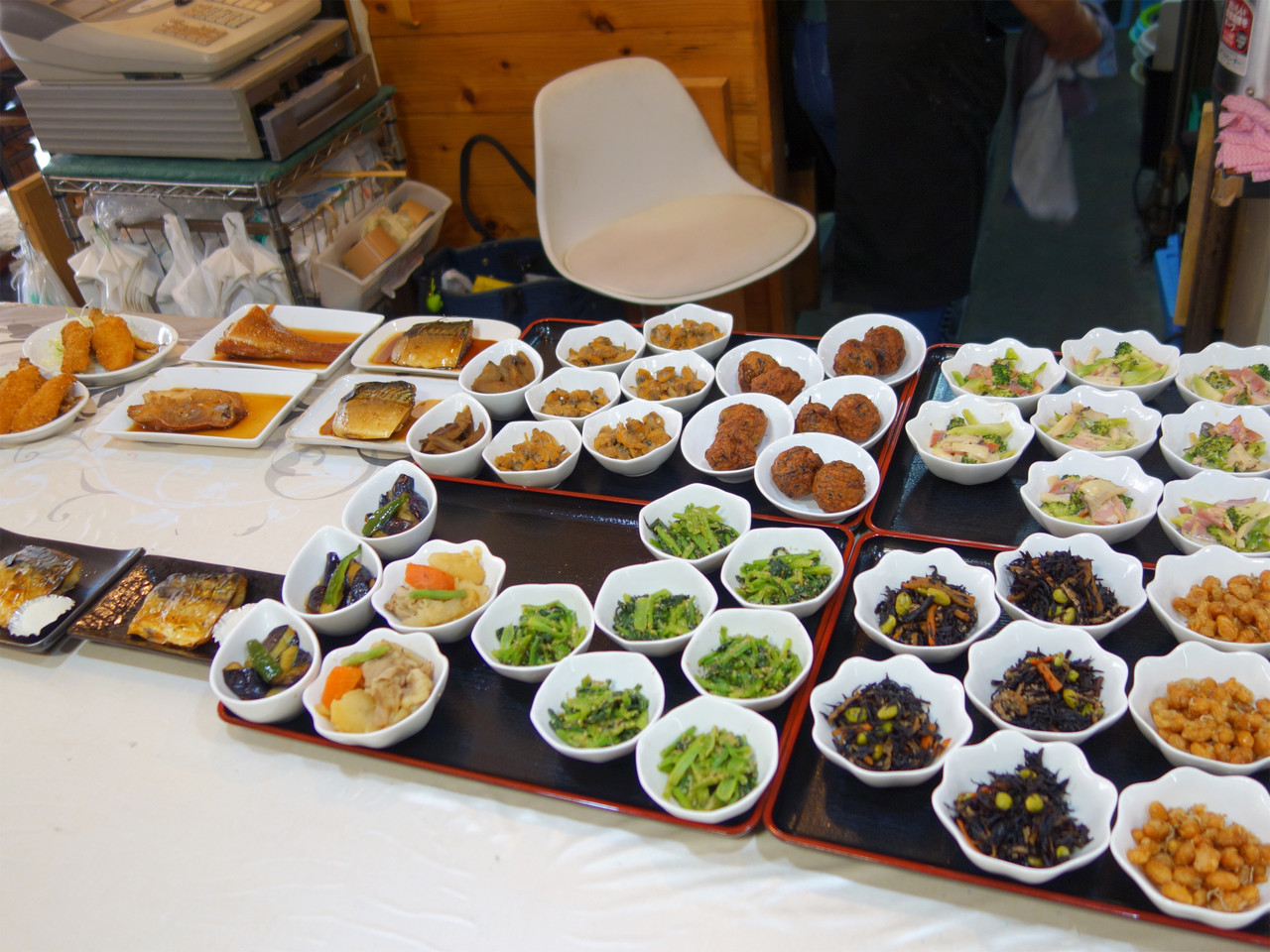 野菜の炒め物・揚げ大豆とじゃこ・ひじきの煮物・肉団子の揚げもの・ほうれん草のおひたし・あさりの佃煮風・ナスの揚げびたし・ゴボウの煮物・肉じゃが。