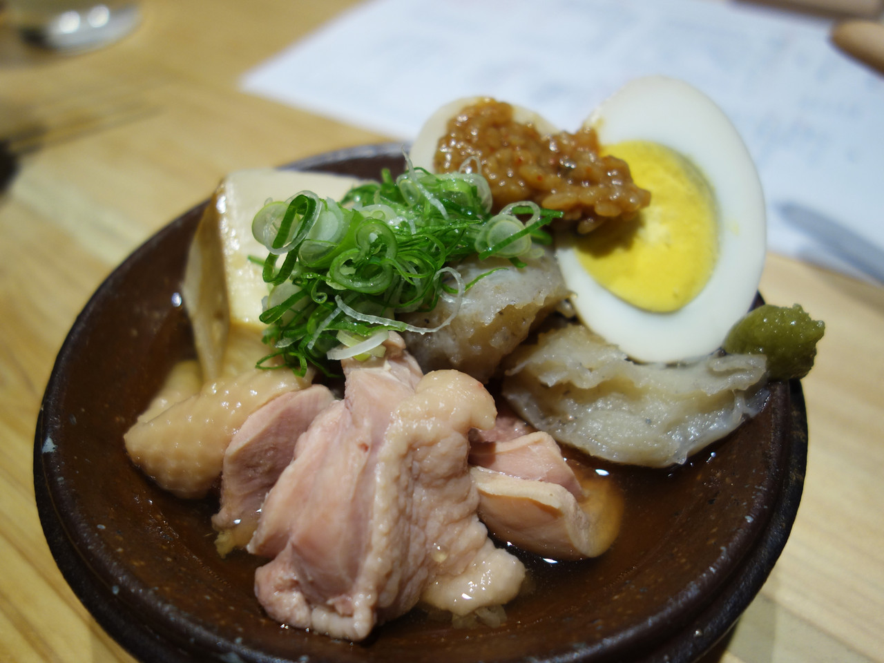 高坂地鶏のガラ100%のスープで煮込んだ鶏の内臓・団子・肉・ゴボウ・豆腐・玉子・コンニャクが入っています。