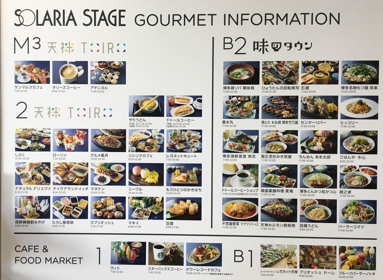 『天神TOIRO』や『味のタウン』を含む天神ソラリアステージには沢山の飲食店があるので、