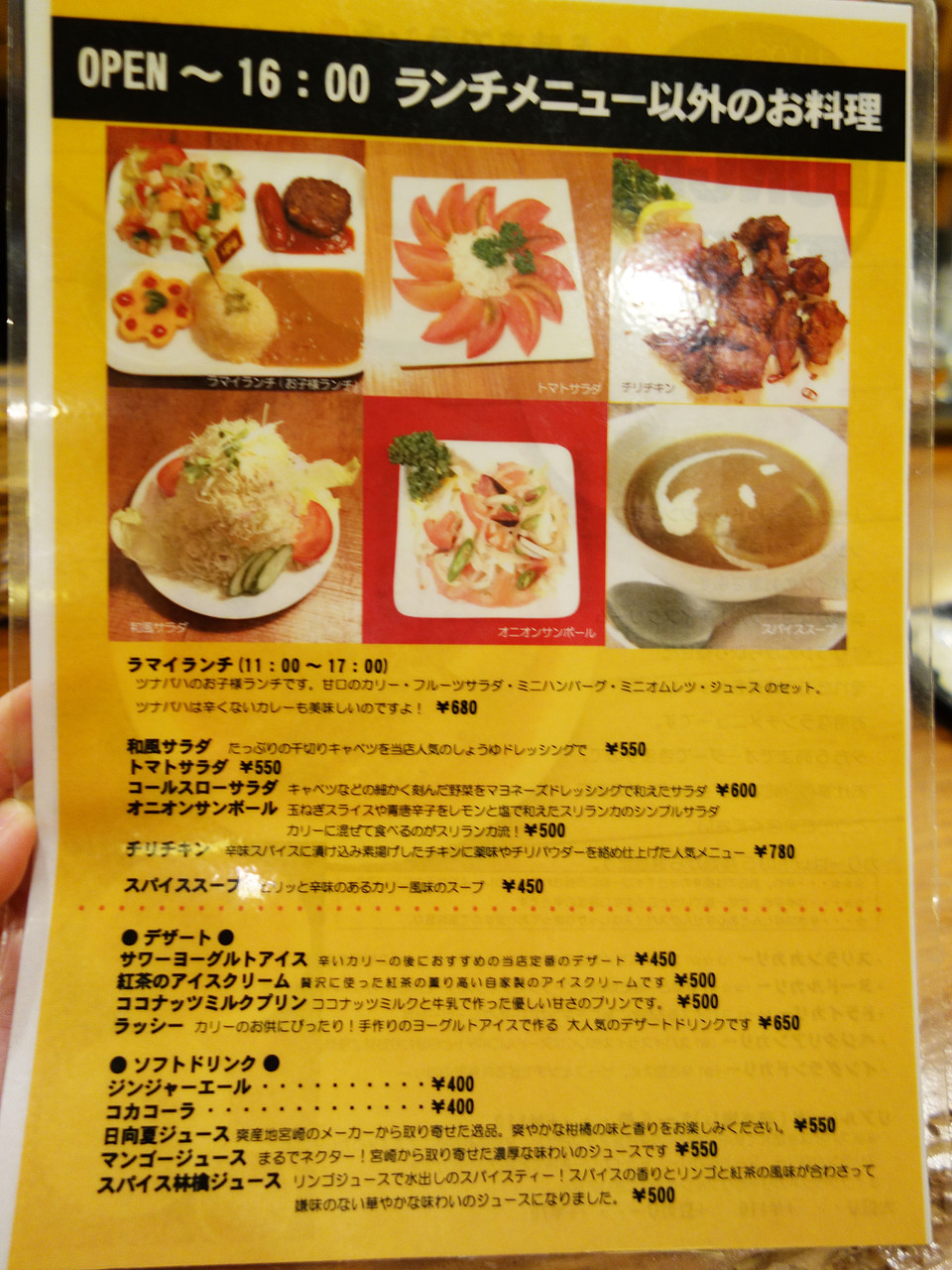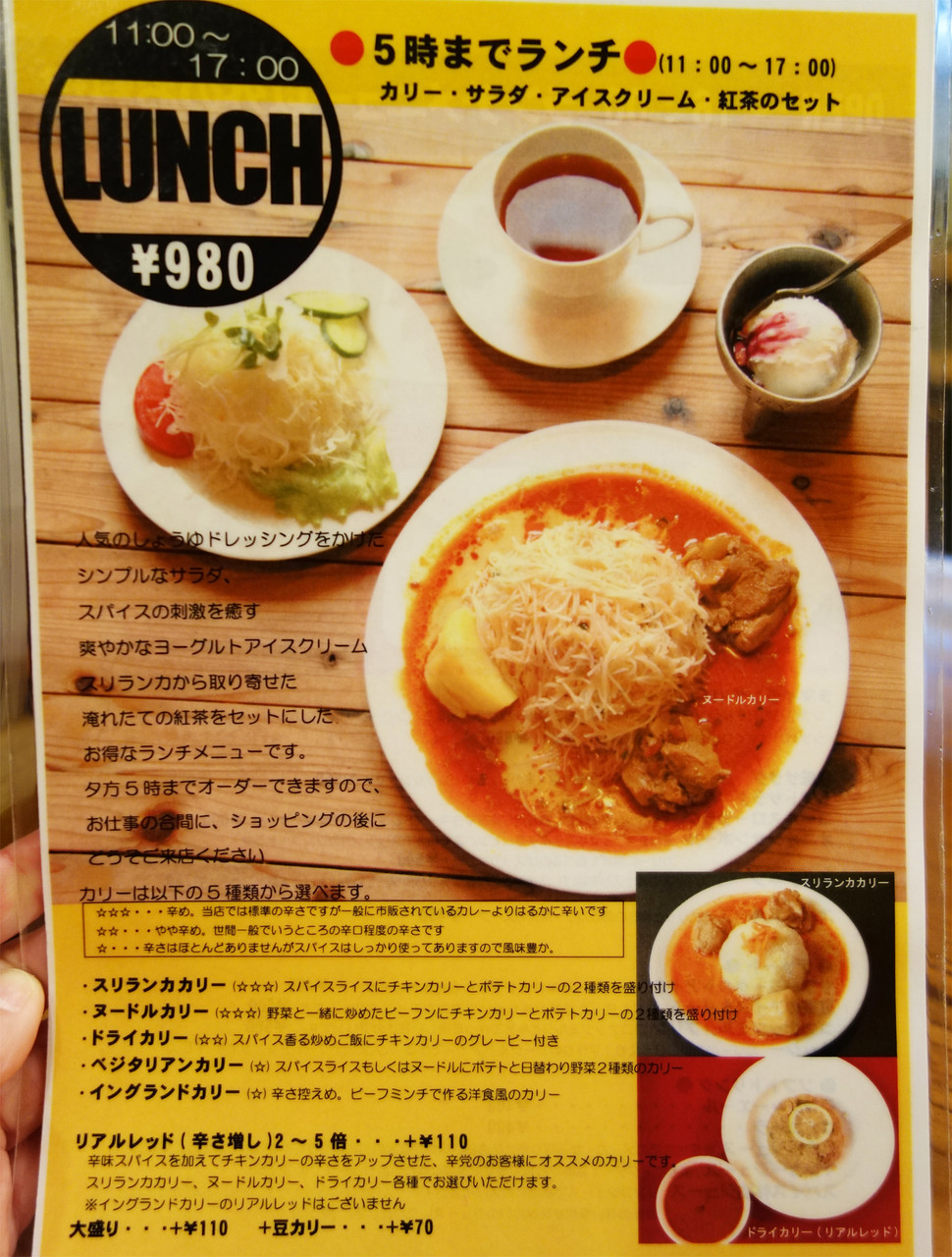 カリーは、スリランカカリー・ヌードルカリー・ドライカリー・ベジタリアンカリー・イングランドカリーの5種類です。