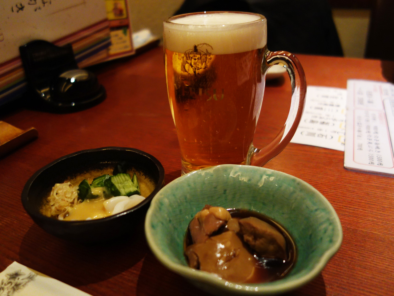 お通しは、イカのぬた和えと鶏レバーの柔らか煮でした(2名分)。