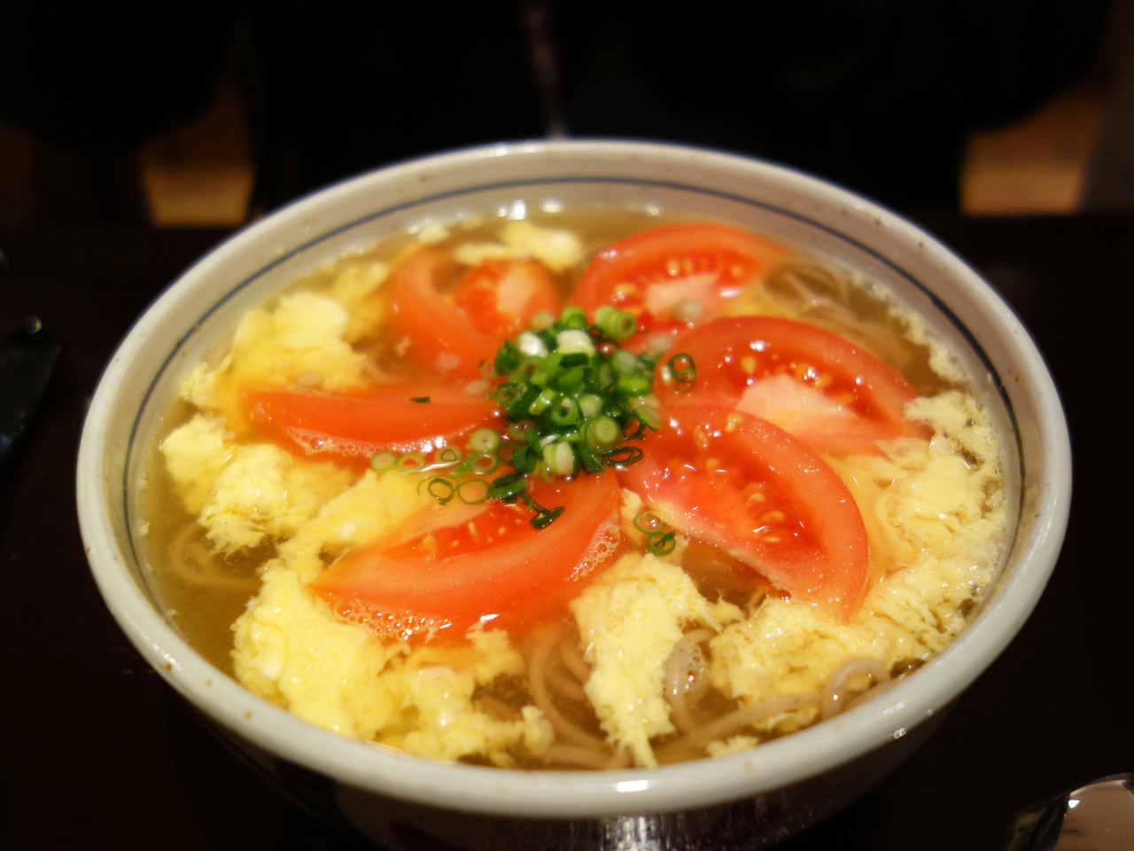 トマトの玉子とじは中華のイメージでしたが、すっきり淡麗のおつゆの蕎麦にも合ってました。