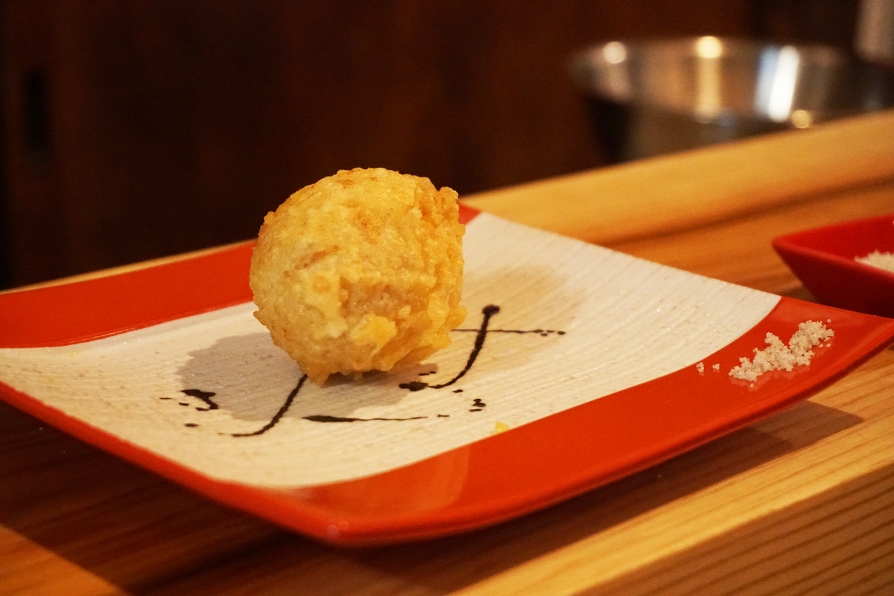 卵はほんのり味付けしてあり、揚げたてをトリュフの塩で頂きます。