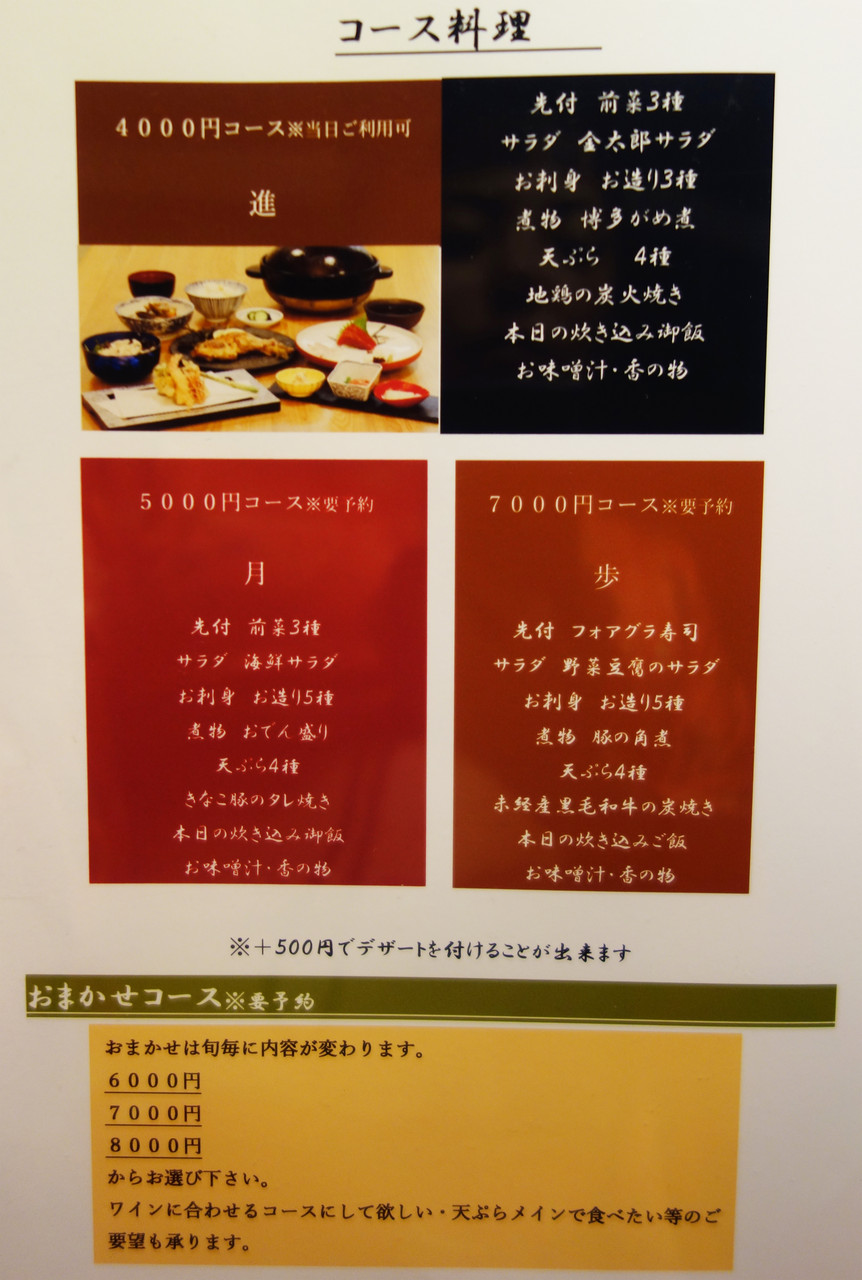 6,000円からのおまかせコースでは、ワインに合わせた料理や天ぷらメインで楽しむ構成など、リクエストも可能だそうです。
