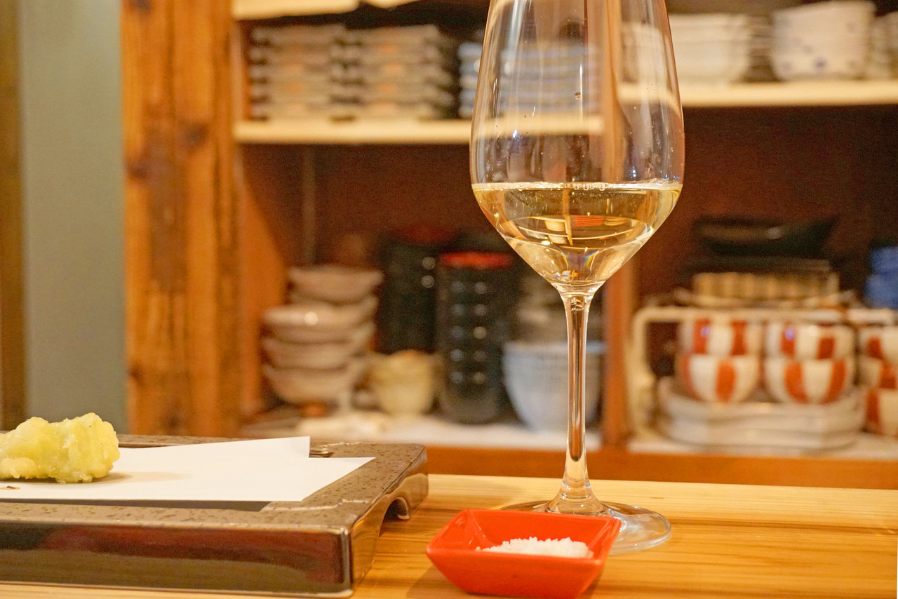店主さんにお願いして、このチーズの天ぷらに合う白ワインを頂きました。