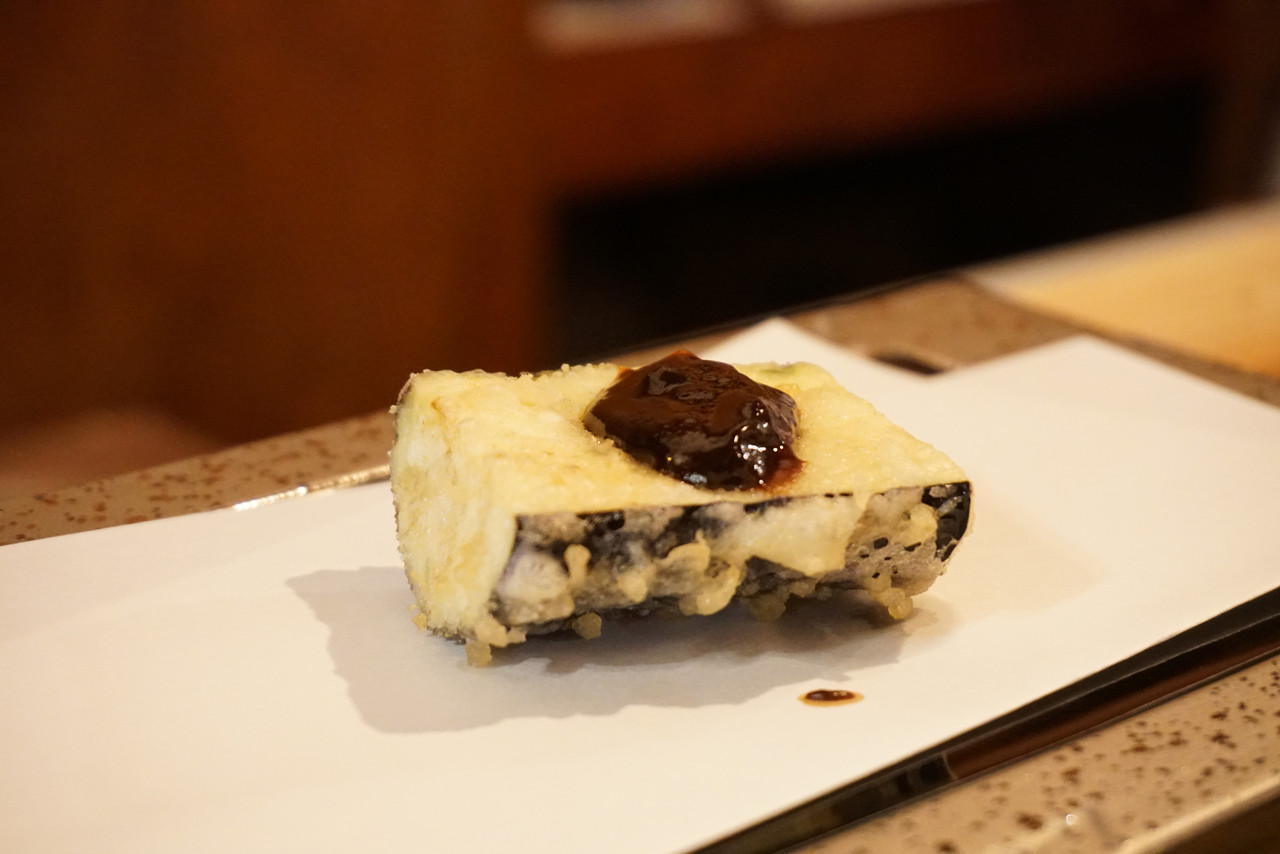 ナスの天ぷらは大好きですが、甘い田楽味噌と一緒に頂くのは初めてです。