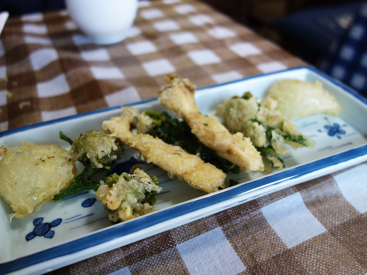 更にサービスで下さった新玉ねぎ・菜の花・エリンギの天ぷら。