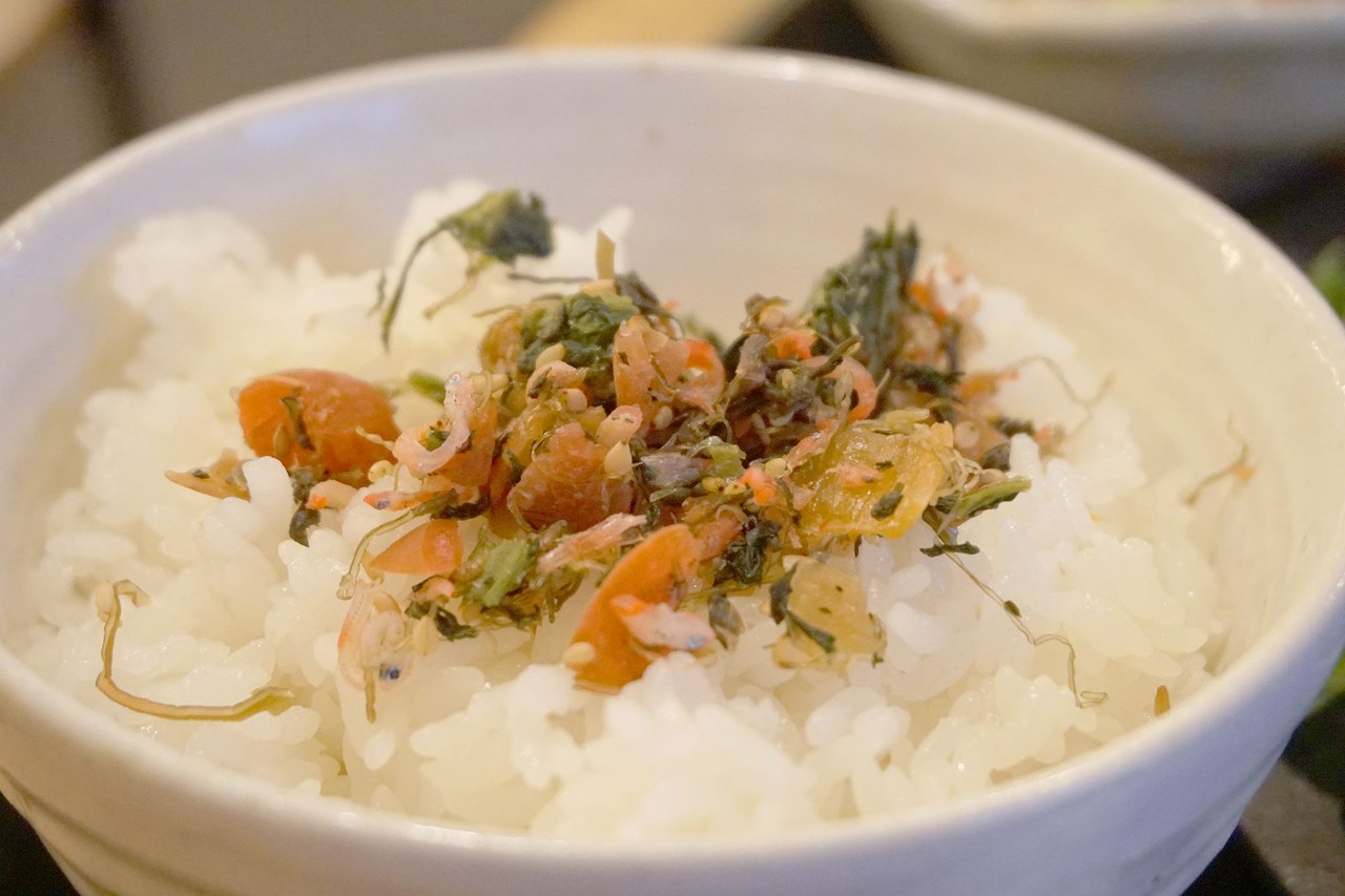 梅のカリッとした歯応え、魚の乾物の旨味、菜っ葉の漬物の風味が見事にコラボした逸品です。