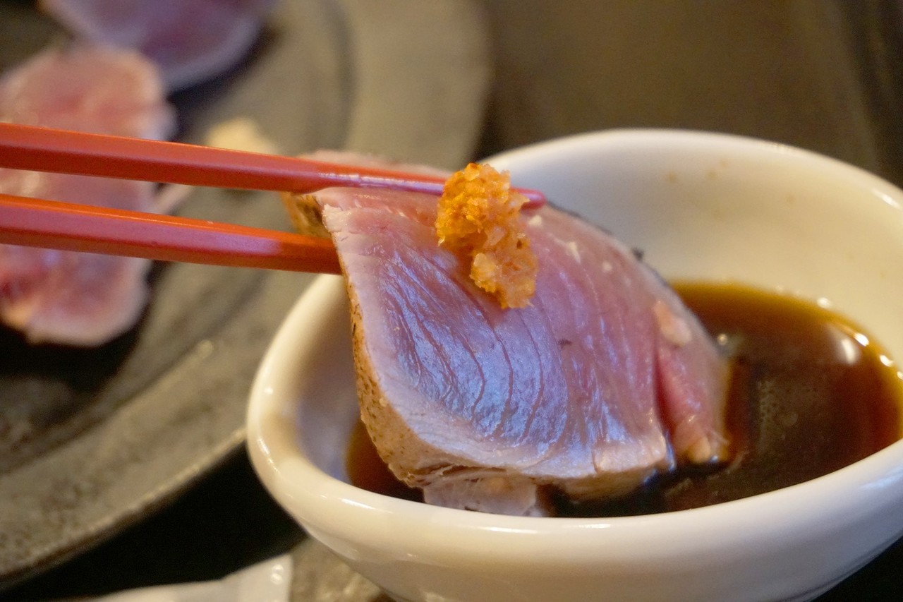 分厚く引かれた鰹をおろし生姜と紅葉おろしで頂きます。