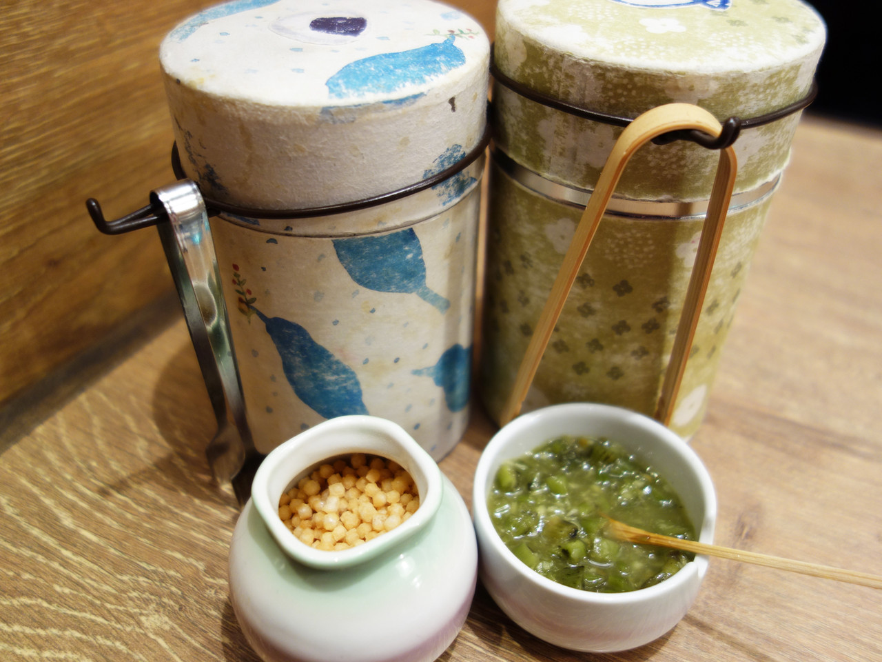 お好みで、卓上の鰹節・刻み海苔・あられ・刻みワサビをトッピング。