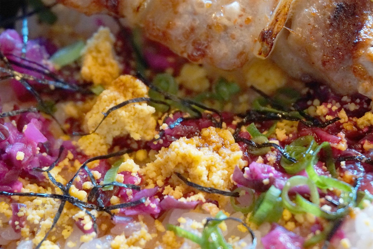 2種のネギマのタレ焼きと豚バラ串がトッピングされてます。