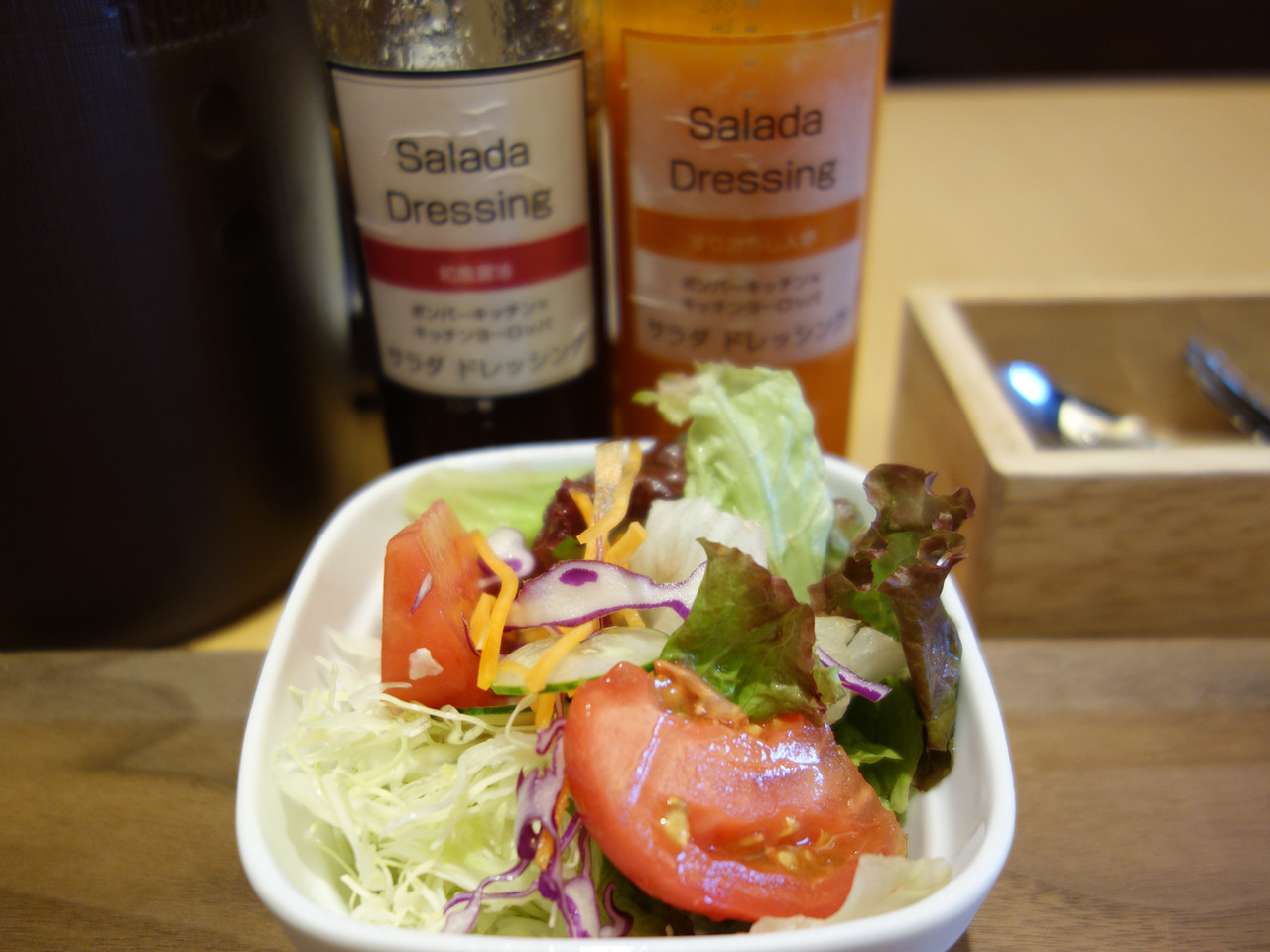 ミニサラダのドレッシングは自家製で、和風醤油と人参の2種類です。