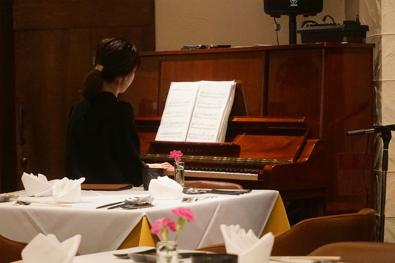ピアノの生演奏が流れ、オープンキッチンでは、姉妹店・金蔦出身の料理長をはじめ、シェフたちの華麗なパフォーマンスが繰り広げられています。