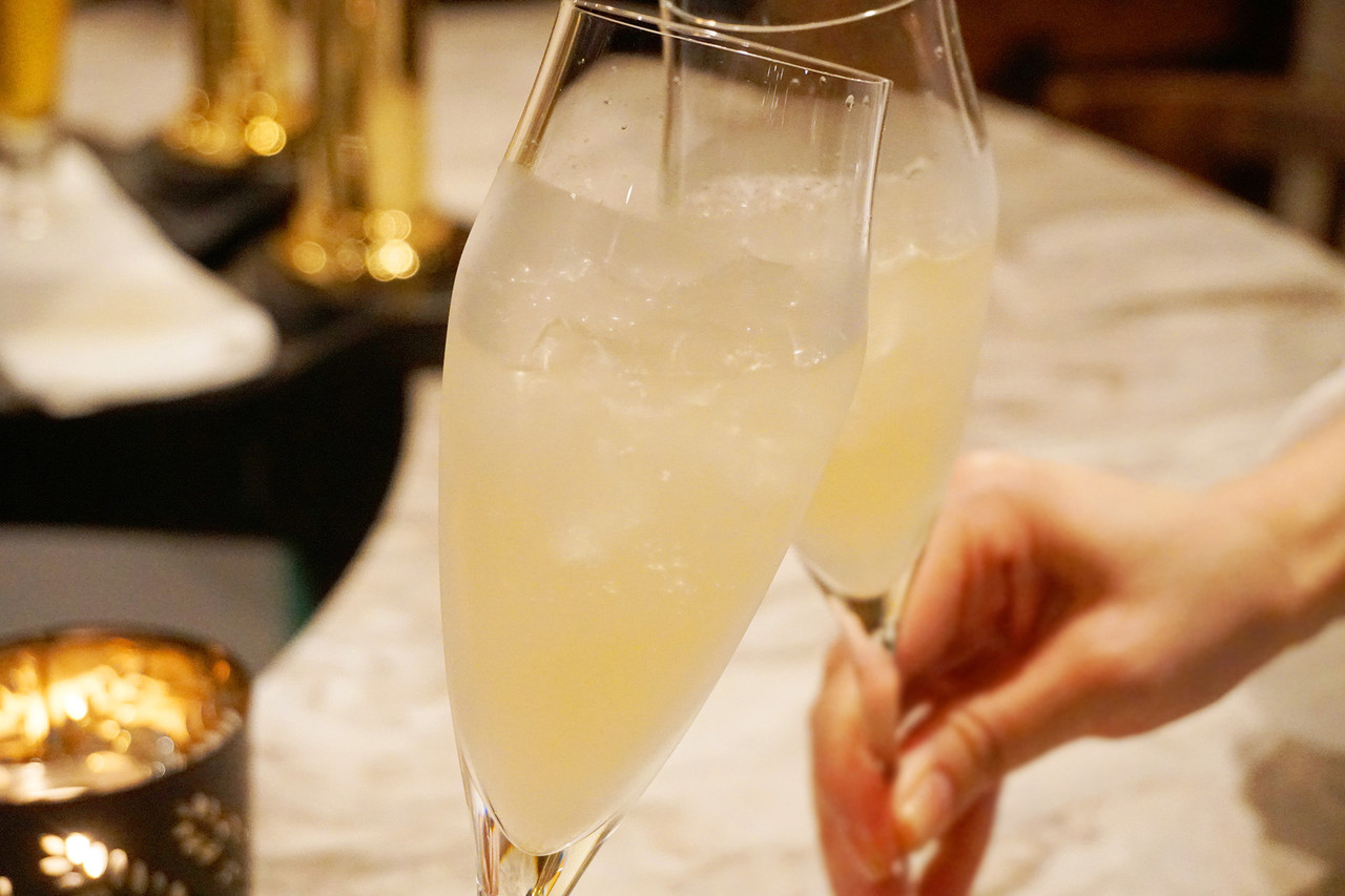 ウェイティングバーで、ウェルカムドリンクの自家製ジンジャエールを頂き、メインフロアへ。