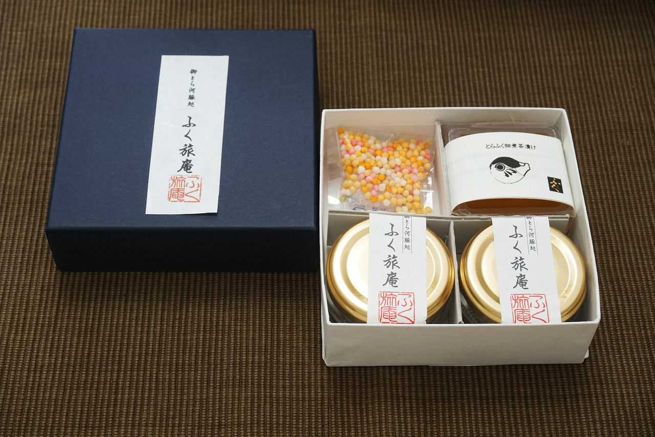 中身は4人分相当で、河豚のしぐれ煮×2瓶・お出汁のジュレ×1・五色あられ×1が入ってました。