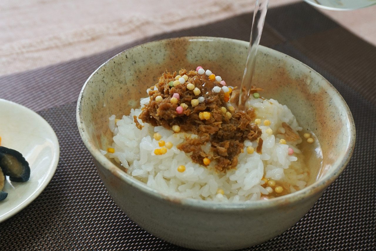 お湯を注ぐと程良い味加減のお茶漬けになります。