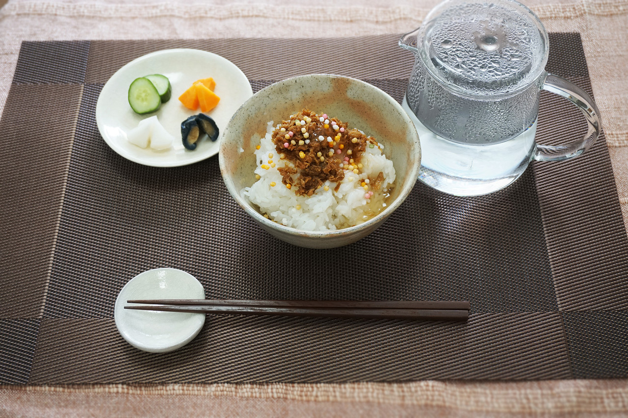 お茶碗にご飯をよそい、しぐれ煮1/2瓶とジュレ適量をのせ、白湯を注いで、あられを振りかけて完成です。