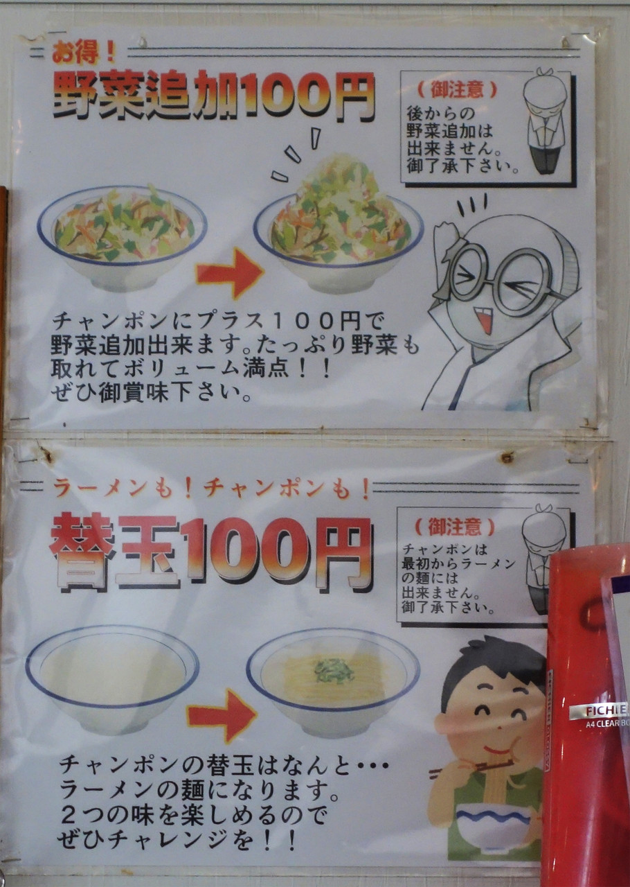 チャンポンの替玉も+100円で出来ますが、その場合はチャンポン麺(太麺)ではなく、ラーメン用の細麺になります。