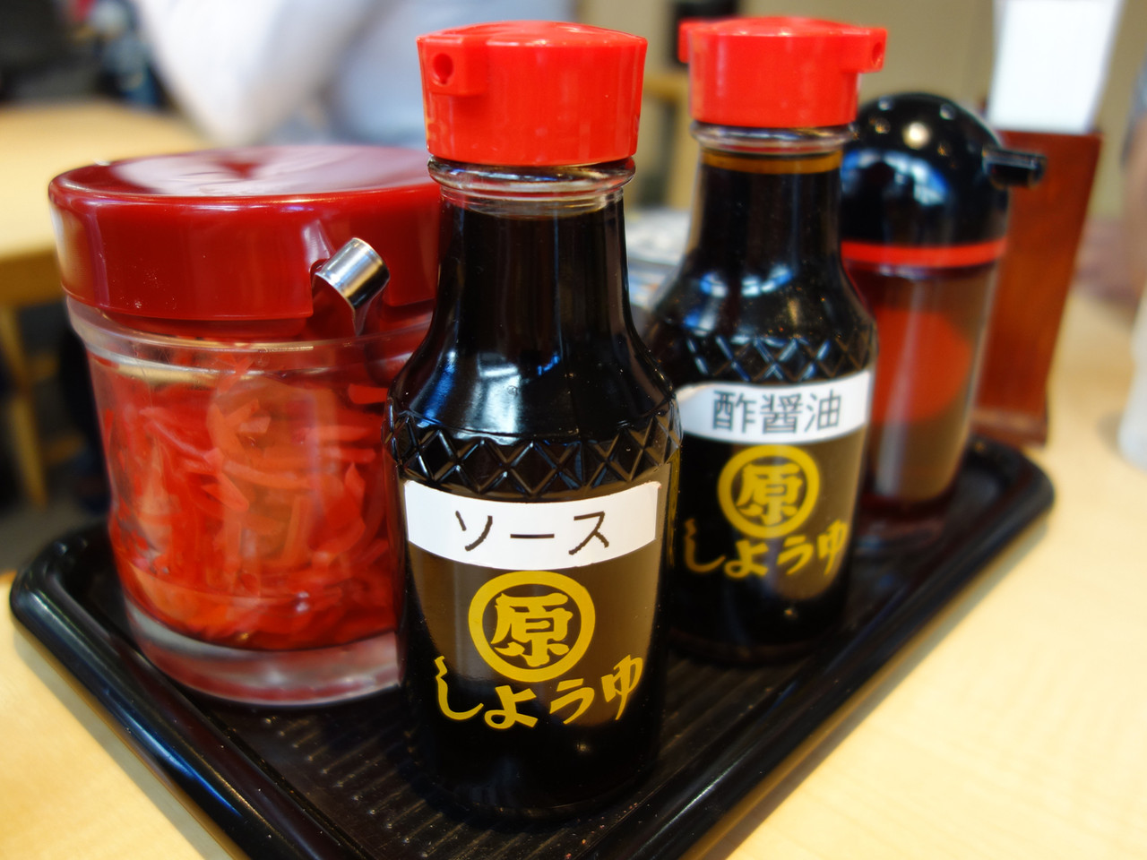 卓上には、紅しょうが・ソース・酢醤油・コショウなどが置いてあります。