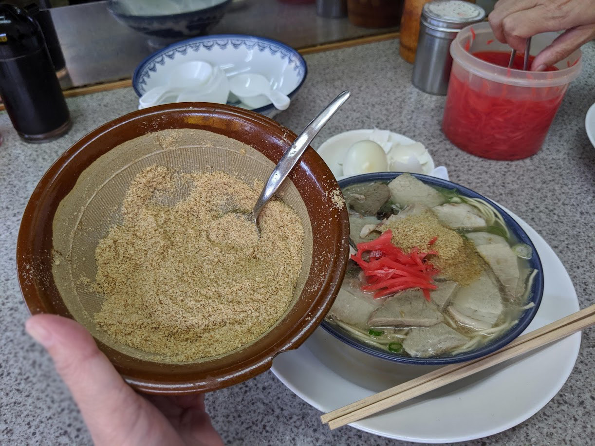 豚骨ラーメン店の卓上に付き物のゴマですが、こちらのはサラサラのスリゴマ状です。