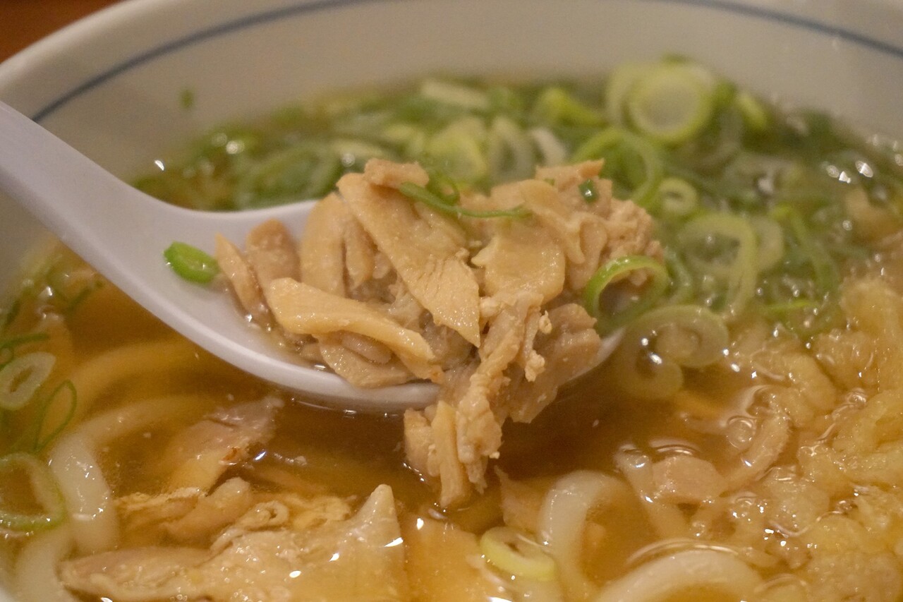 かしわうどんは、醤油で甘めに煮た鶏肉に、生姜がトッピングされたうどん。