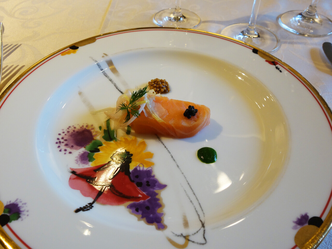 冷たい前菜:“英国王室御用達”スコットランドサーモンの低温コンフィ スパイシーマスタードとフレッシュキャビアを添えて