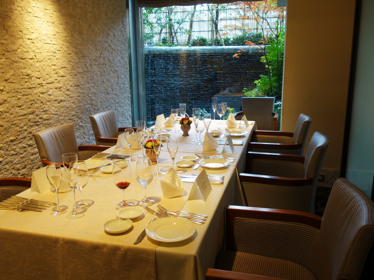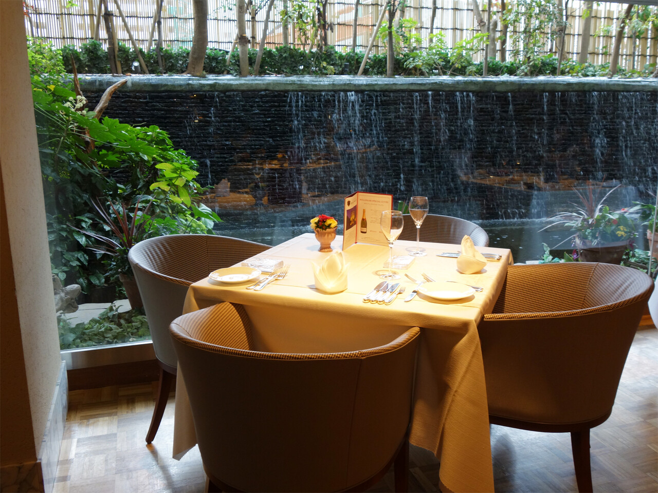 窓越しに水が流れる滝を眺めながら、お食事ができるフレンチレストラン『ラ・カスカドゥ』はホテル1階にあります。