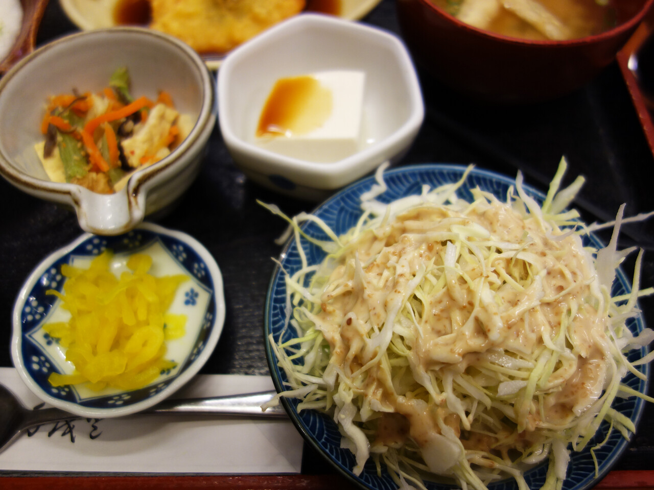 小鉢の他に、ゴマドレッシングがけのキャベツサラダもたっぷり付いています。