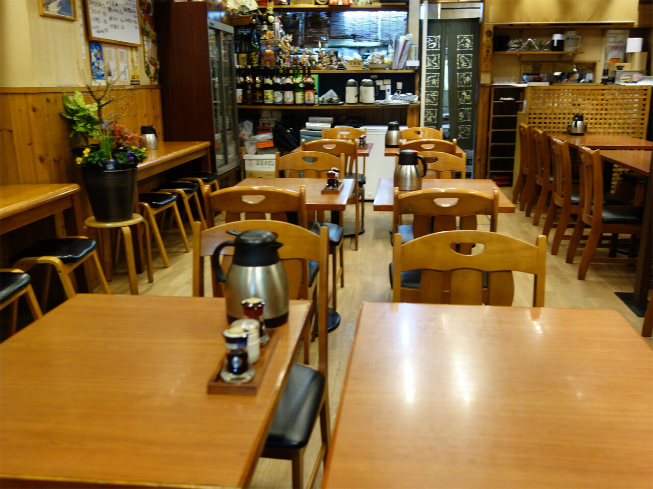 先客の若者男子グループの定食のご飯が全員マンガ盛りなのに驚きながら、テーブル席に着きます。