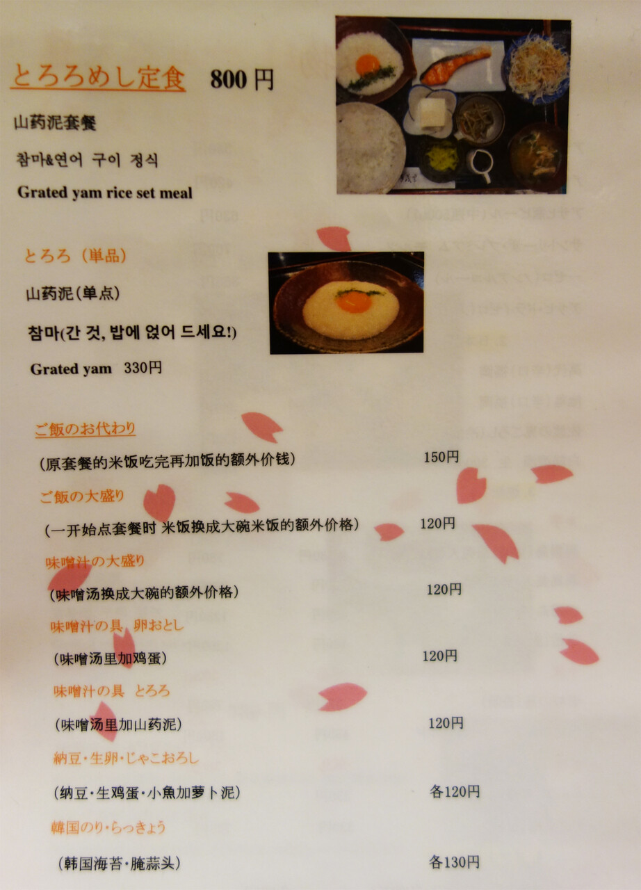 天ぷら定食930円・穴子天ぷら丼800円・海鮮丼950円・豚天ぷら定食930円・とり天とろろ飯定食830円・とろろ飯定食800円。