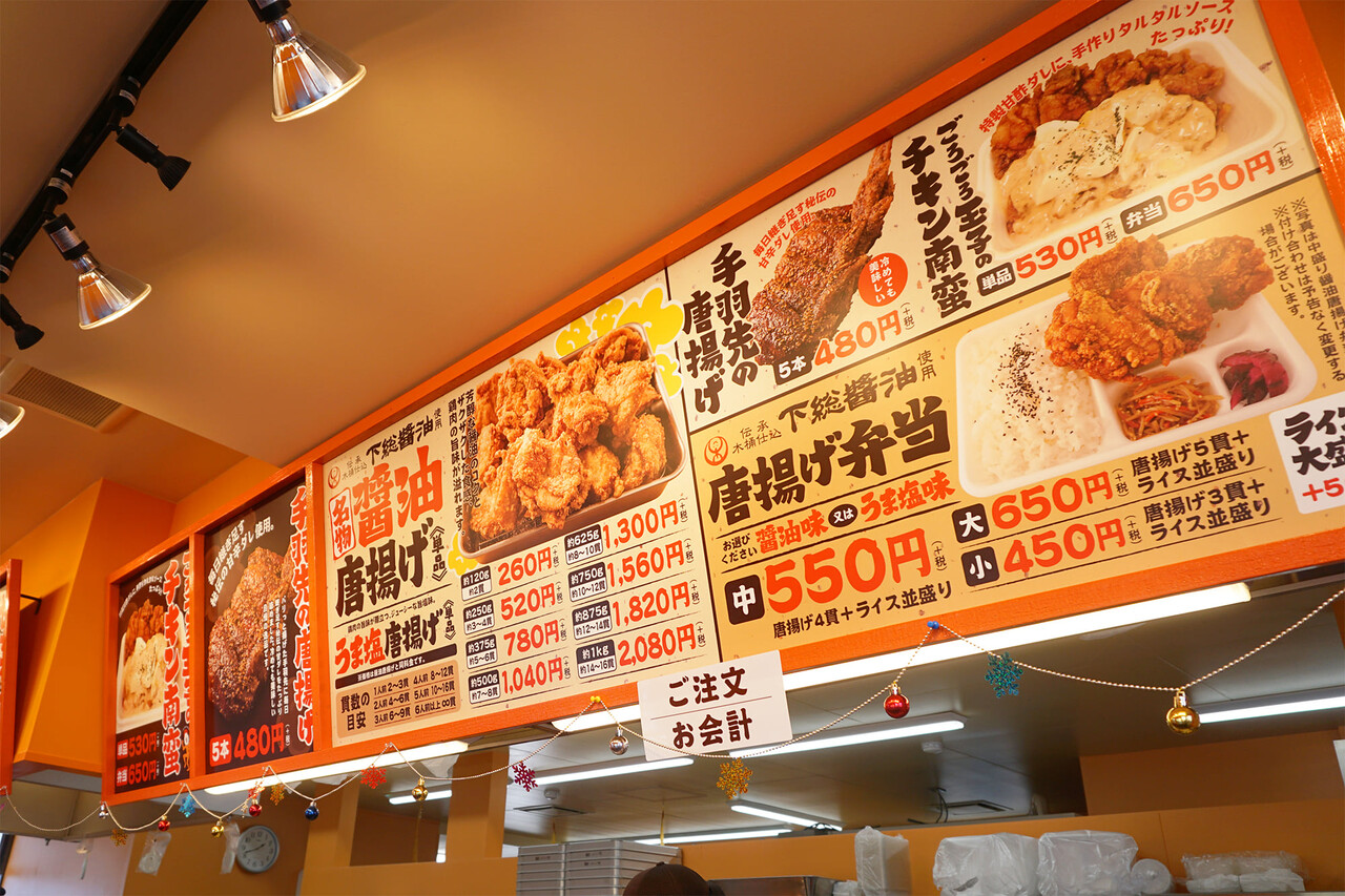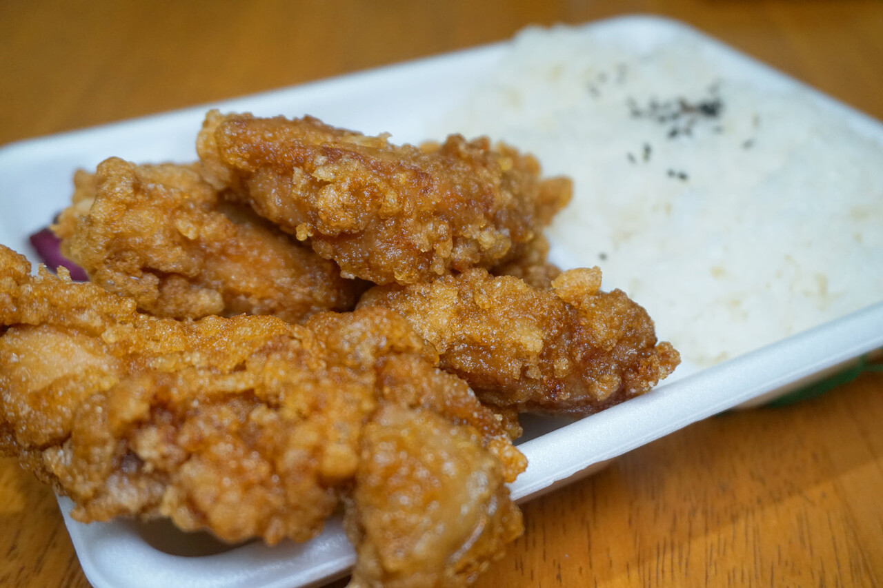 唐揚げは名物醤油味と塩味があり、単品の他、お弁当もあります。
