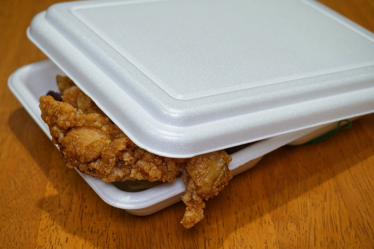 まず驚くのが、お弁当のパックから唐揚げがはみ出していること。
